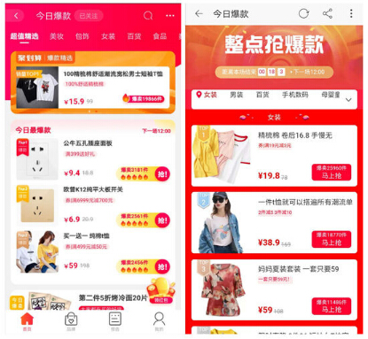 另外,位于功能区域的“聚划算”频道也修改为“今日爆款”频道。据了解,“今日爆款”主要按不同品类整理出整点时段的热销商品榜单,并对其销量进行展示,有利于增加聚划算商品的推广和曝光。