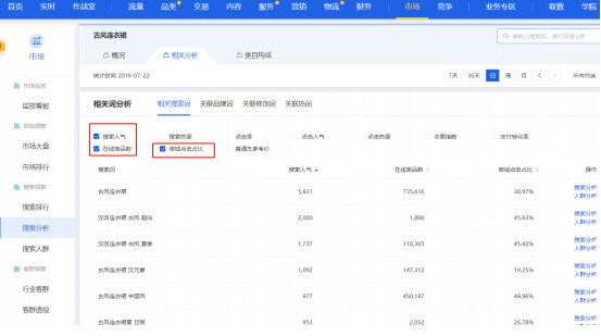 勾选搜索人气、在线商品数,如果不是天猫店就还要勾选商城点击占比。