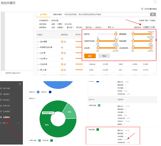 精准单独款的测试,关键词通过两个渠道来找,一个是生意参谋-市场洞察-搜索排行,找到一些符合你的产品属性的飙升词,搜索人气高的词。再有一个方法就是通过我们的直通车添加关键词词库,进行筛选,筛选相关性最低4-5,展现在10000-50000(非标品)/8000-50000(标品)然后点击率尽量在我们的行业点击率之上,行业点击率,就根据我们这个产品的核心词来点击之后看流量解析中,数据透视中的无线端行业均值点击率进行对比,选词在10-20个。选出来的词,低于7分的都删除,如果都是低分词,可能是计划权重较低,就选择相对比较好的词。关键词的出价决定了展现曝光,所以我们的关键词出价尽量都出在前三,或者首条,这样子见效更快,这样子出价之后,我们所有的词都使用精准匹配先,发现没有展现,再开启广泛匹配。